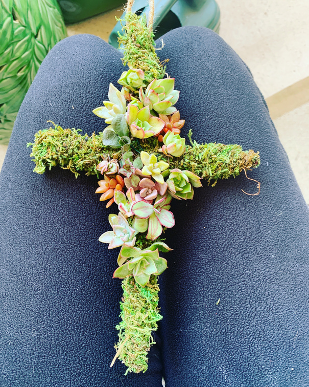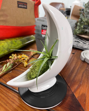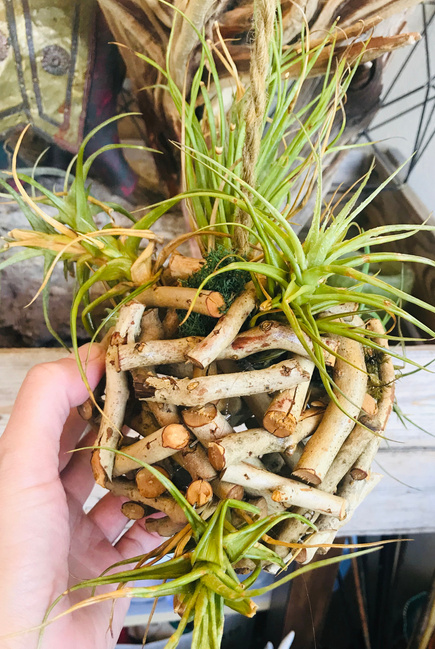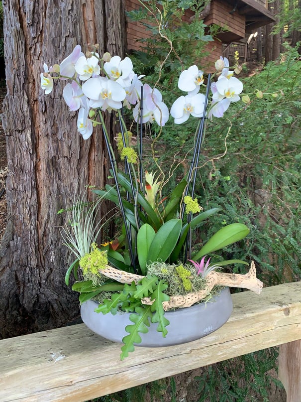 Olive trunk, assorted tillandsias, bromeliad, sansevierias, silver brunia, lichen and reindeer moss.